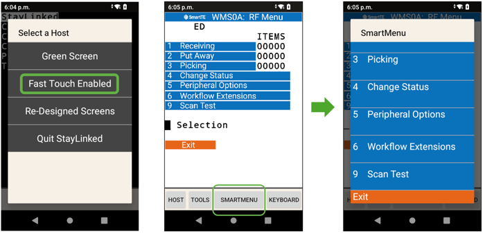 In the Fast Touch Enabled version of the demo, on the RF Menu screen, tap the SMARTMENU button. The SmartMenu feature in SmartTE dynamically displays lists in a large, scrollable format for the user; perfect for small touch screens and gloved operation.